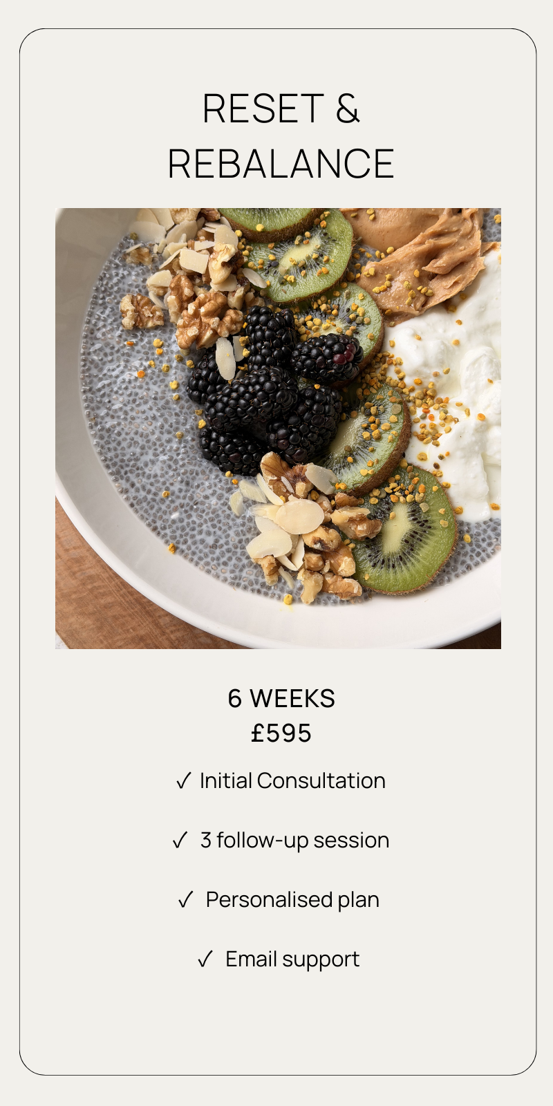 My method focuses on long-term transformation. Through a structured 1:1 programme, we’ll work together over 6, or 10 weeks to help you rebalance, rebuild, and nourish your body in a way that feels empowering — not overwhelming. You’ll gain the tools, confidence and clarity to make changes that last.